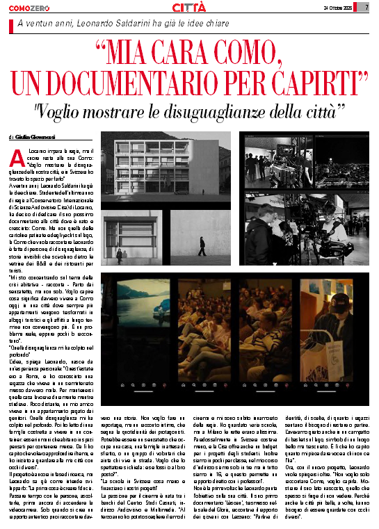 A ventun anni, Leonardo Saldarini ha già le idee chiare. Studente dell’ultimo anno di regia al Conservatorio Internazionale di Scienze Audiovisive (Cisa) di Locarno, ha deciso di dedicare il suo prossimo documentario alla città dove è nato e cresciuto: Como. Ma non quella delle cartoline patinate e degli yacht sul lago, la Como che vuole raccontare Leonardo è fatta di persone, di disuguaglianze, di storie invisibili che scivolano dietro le vetrine dei B&B e dei ristoranti per turisti.