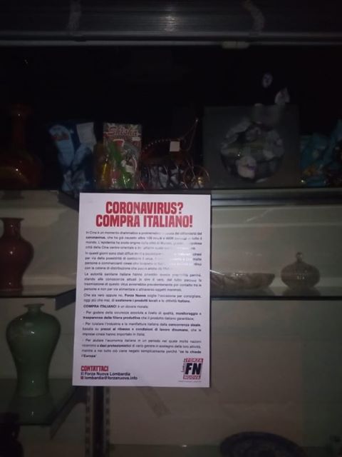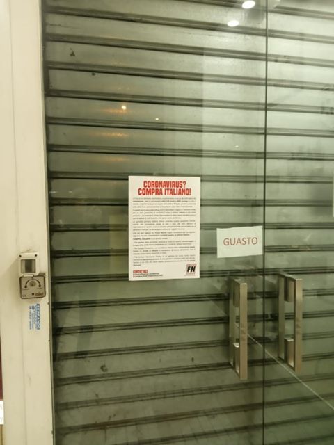 Diversi manifesti sono stati affissi alle vetrine degli esercizi asiatici con un messaggio dal titolo: “Coronavirus? Compra italiano”, come è possibile vedere da alcune foto della vergognosa azione notturna diffuse dalla sezione territoriale del partito neofascista.