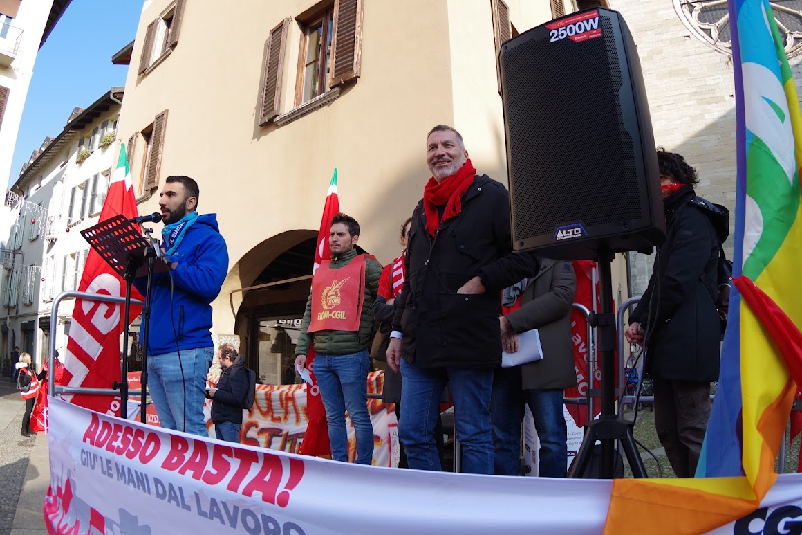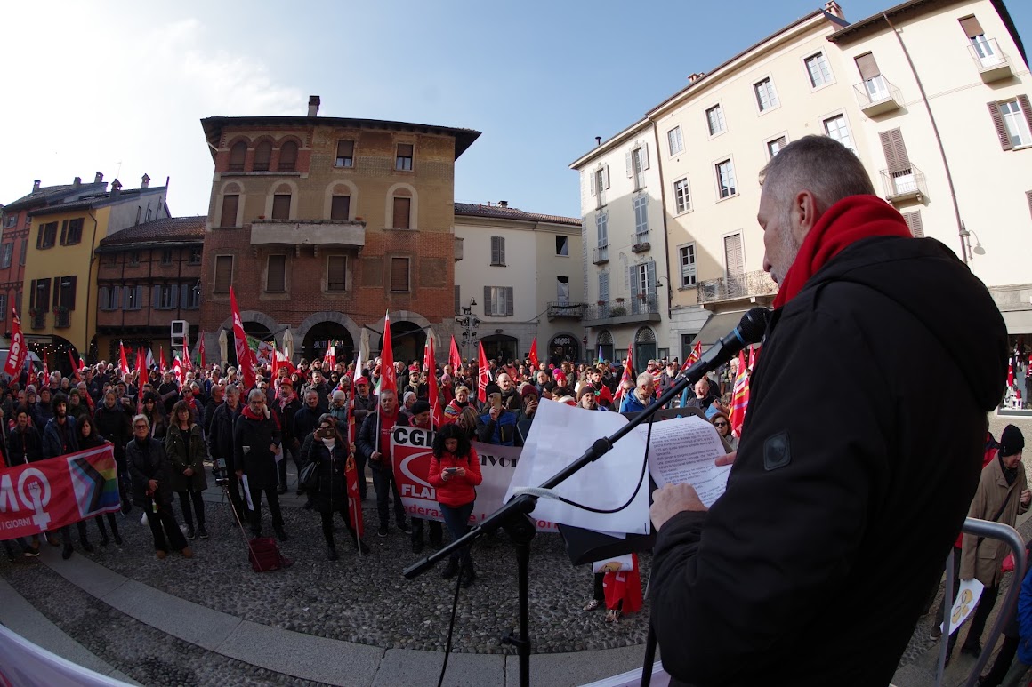Al mattino la manifestazione di Como è iniziata con un corteo che è partito alle 9,30 da porta Torre per inondare le vie del centro storico fino ad arrivare in piazza San fedele, dove si è tenuto un comizio. Il Segretario Generale della Cgil di Como Sandro Estelli ha spiegato le motivazioni dello sciopero: una legge di bilancio che fa piombare il paese in una fase di austerità e soprattutto penalizza lavoratrici e lavoratori dipendenti, pensionati e pensionati “vogliamo una vera riforma fiscale progressiva che garantisca la redistribuzione vera delle risorse” spiega Estelli, e ancora dice “Abbiamo bisogno di finanziamenti significativi per rilanciare una sanità che è al collasso e un sistema di istruzione sempre meno valorizzato dalla politica nazionale. Rivendichiamo il rinnovo dei contratti pubblici, chiediamo il rilancio di politiche industriali serie. Flat tax e concordato preventivo non sono altro che strumenti per avvantaggiare i più ricchi e incentivare chi non paga le tasse a continuare a farlo. Ancora una volta questo governo chiude gli occhi di fronte al problema dell’evasione fiscale, piaga che colpisce il nostro sistema economico. Non vogliamo mance natalizie, non ci accontentiamo di 100 € che cercano di mascherare le disuguaglianze. Rigettiamo la politica dei bonus che si limita a tamponare le difficoltà economiche senza affrontarne le cause profonde. Solo con interventi strutturali e scelte coraggiose possiamo garantire un futuro equo per tutte e per tutti. ogni giorno nei luoghi di lavoro avvengono tragedie evitabili e i recenti incidenti mortali dimostrano quanto sia fragile il sistema di tutela della sicurezza. La patente a crediti è una misura debole e insufficiente, chiediamo investimenti in sicurezza, risorse per potenziare gli ispettorati del lavoro, per garantire controlli rigorosi e protezione per chi lavora. Il decreto sul lavoro è un’altra misura inadeguata: accresce la precarietà e penalizza i giovani e le categorie più fragili, è necessario avviare un confronto serio con le parti sociali”.