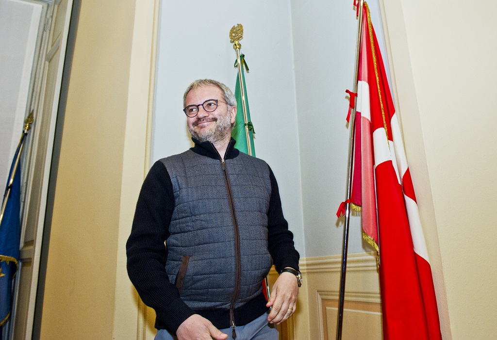 E infatti il deputato leghista prima dello scatto istituzionale ha asportato con le proprie mani la bandiera azzurro-stellata, l’ha appoggiata poco distante e infine si è lasciato immortalare in mezzo agli altri due vessilli, quello cittadino e quello italiano.