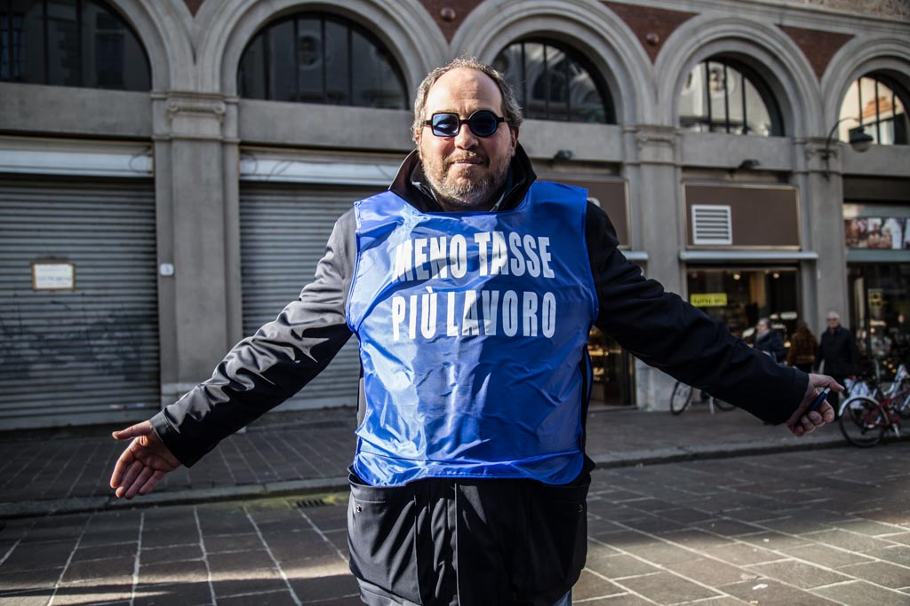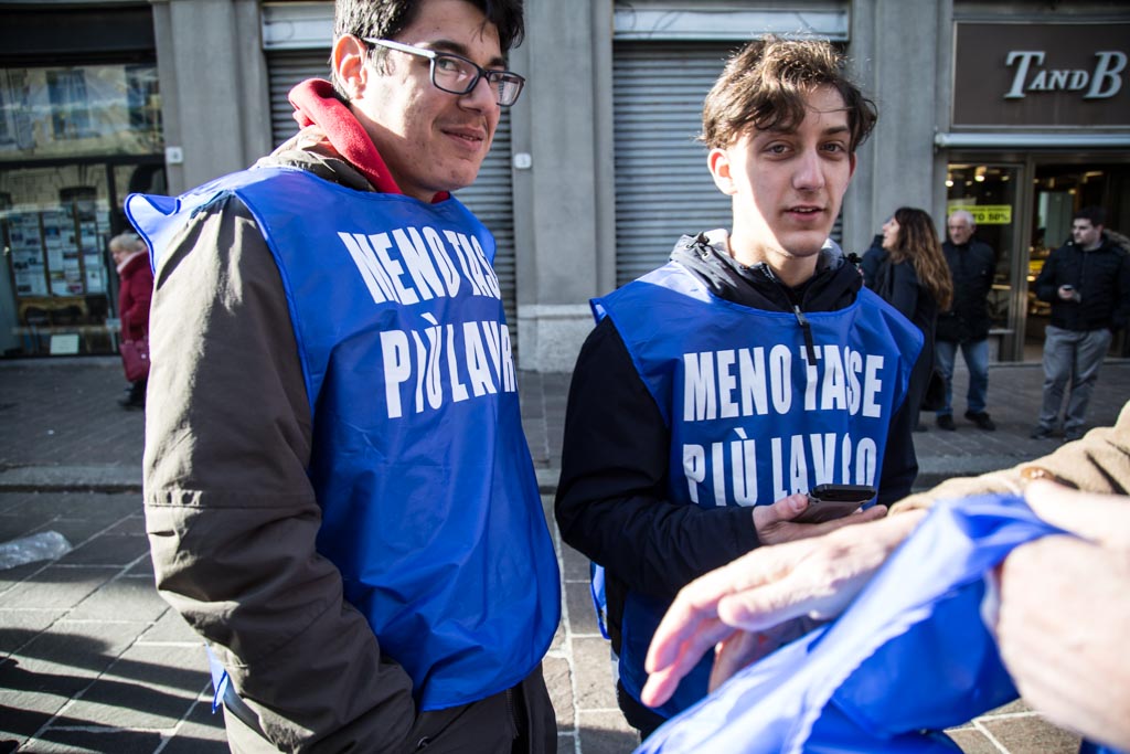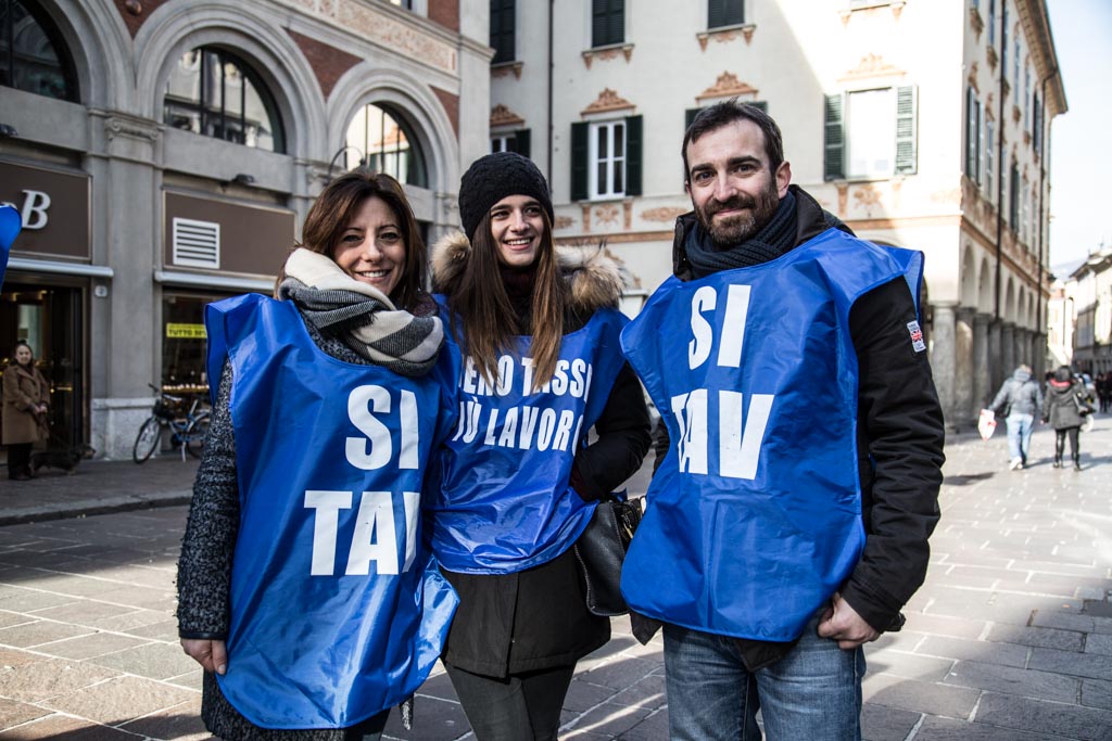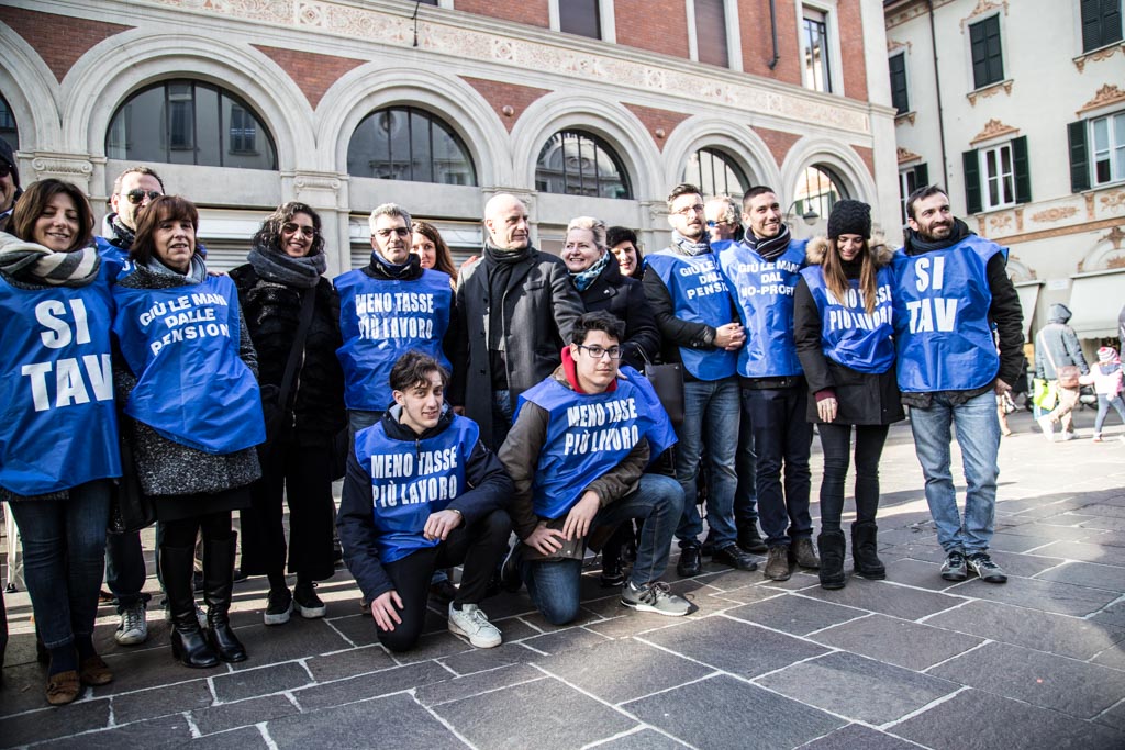 Sulle pettorine indossate dai manifestanti, raccolti attorno al gazebo, campeggiavano gli slogan “Meno tasse, più lavoro”, “Si TAV”, “Giù le mani dal No profit”.