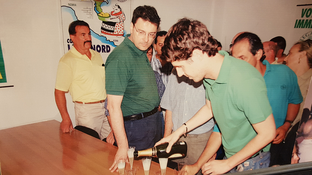 Così le pareti e i manifesti antichi sono ancora più lontani. Segno che la nuova generazione ormai è ben indirizzata nel percorrere il Cammino di Matteo: quella che ha visto sparire il Nord da ogni fazzoletto e bandiera. Umberto Bossi è il padre nobile, Roberto Maroni un ricordo. Rimane ancora, fedele e fedelissimo il capogruppo alla camera, Giancarlo Giorgetti, qui sotto con un Nicola Molteni poco più che implume: