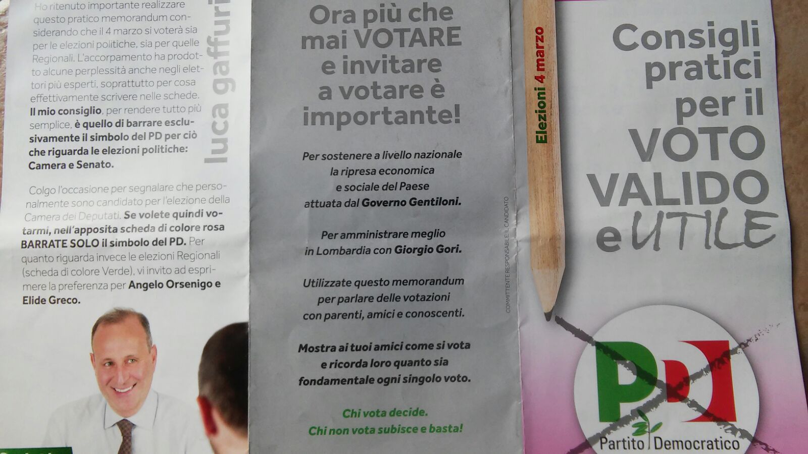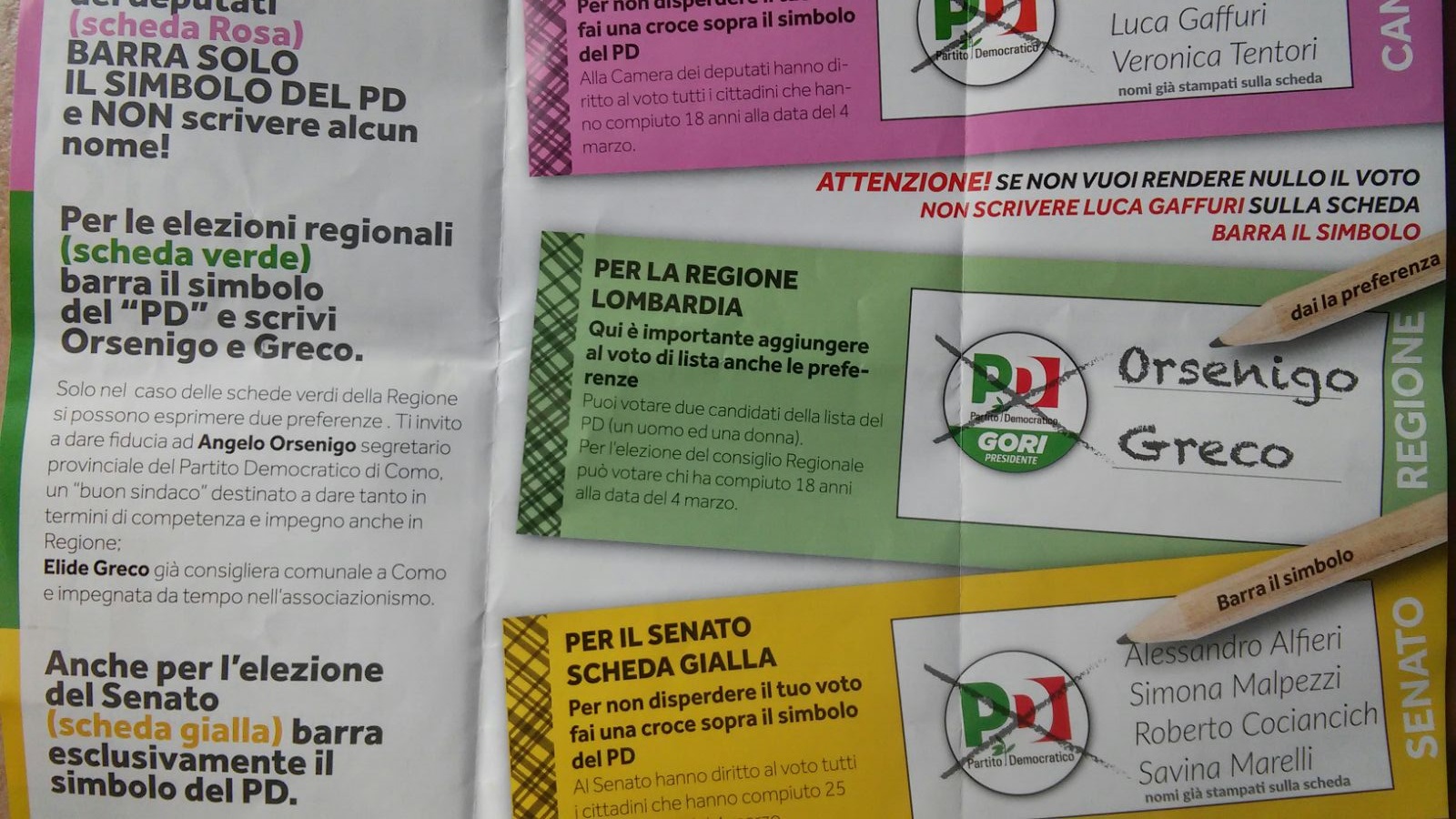 Come dimostrerebbero anche i pieghevoli diffusi in questi giorni (qui sotto un esempio) da Luca Gaffuri dove tra i “Consigli pratici per il voto valido e utile” vengono proposti in grafica alcuni esempi dper una preferenza valida, con altrettante accoppiate di genere: “Orsenigo-Greco” o “Orsenigo-Livio”. Nessuna traccia, di Alberto Gaffuri.