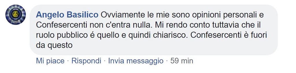 Angelo Basilico si è affrettato a correggere il tiro con un nuovo commento su Facebook: “Ovviamente le mie sono opinioni personali e Confesercenti non c’entra nulla. Mi rendo conto tuttavia che il ruolo pubblico è quello e quindi chiarisco. Confesercenti è fuori da questo”.