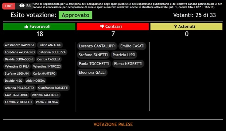 Nel corso della discussione, molti dei consiglieri di opposizione erano intervenuti prima di lui, da Stefano Legnani, Stefano Fanetti e Patrizia Lissi del Pd, passando per Paola Tocchetti (Forza Italia), fino a Elena Negretti (Lega) e Lorenzo Cantaluppi (FdI) quasi tutti per stigmatizzare le novità ritenute troppo stringenti del nuovo regolamento comunale su tavolini, suolo pubblico, tende, tovaglie, fioriere giudicato in più di un’occasione “punitivo” e meritevole di uno stop per ulteriore confronto e approfondimento sulle ricadute per gli esercenti. Dal canto suo il sindaco ha ribattuto che “no, non aspettiamo, sono anni che è atteso questo provvedimento”. Confermata anche l’indicazione per la decadenza delle concessioni in caso di mancato o ritardato pagamento del tributo sull’occupazione del suolo.