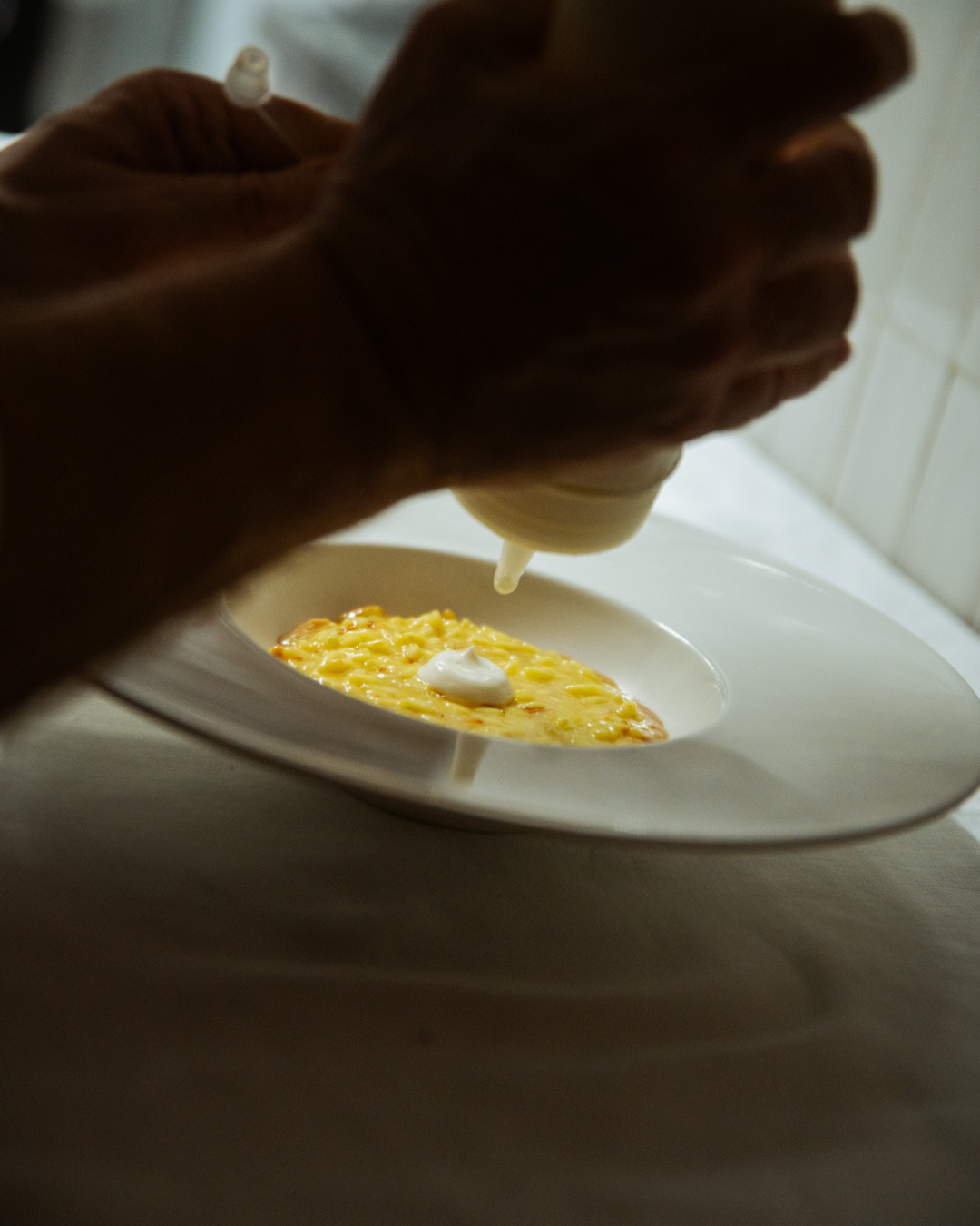 Segue una Mousse di Parmigiano con lime ed aceto balsamico, soffice e avvolgente. Qui la sapidità nobile del formaggio viene alleggerita da luminose note agrumate di lime, mentre delicate gocce di balsamico introducono una sfumatura agrodolce. Un’apparente semplicità che nasconde precisione tecnica e grande sensibilità aromatica.