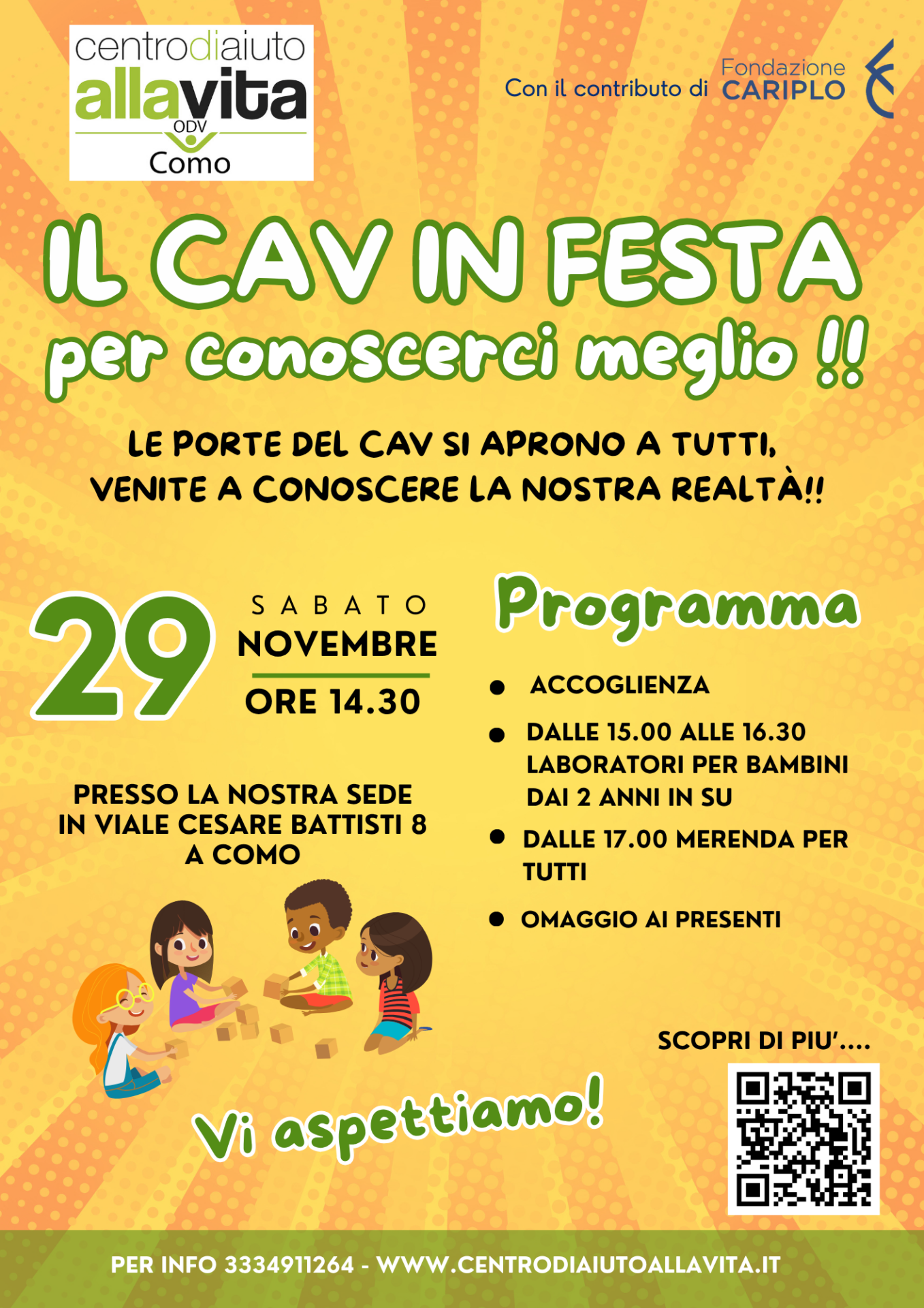 Questo è il programma di una giornata speciale, un momento di incontro e di festa che il Centro di Aiuto alla Vita di Como organizza per sabato 29 novembre 2025 dalle 14.30 presso la sede di viale Cesare Battisti 8, grazie al prezioso contributo di Fondazione Cariplo.