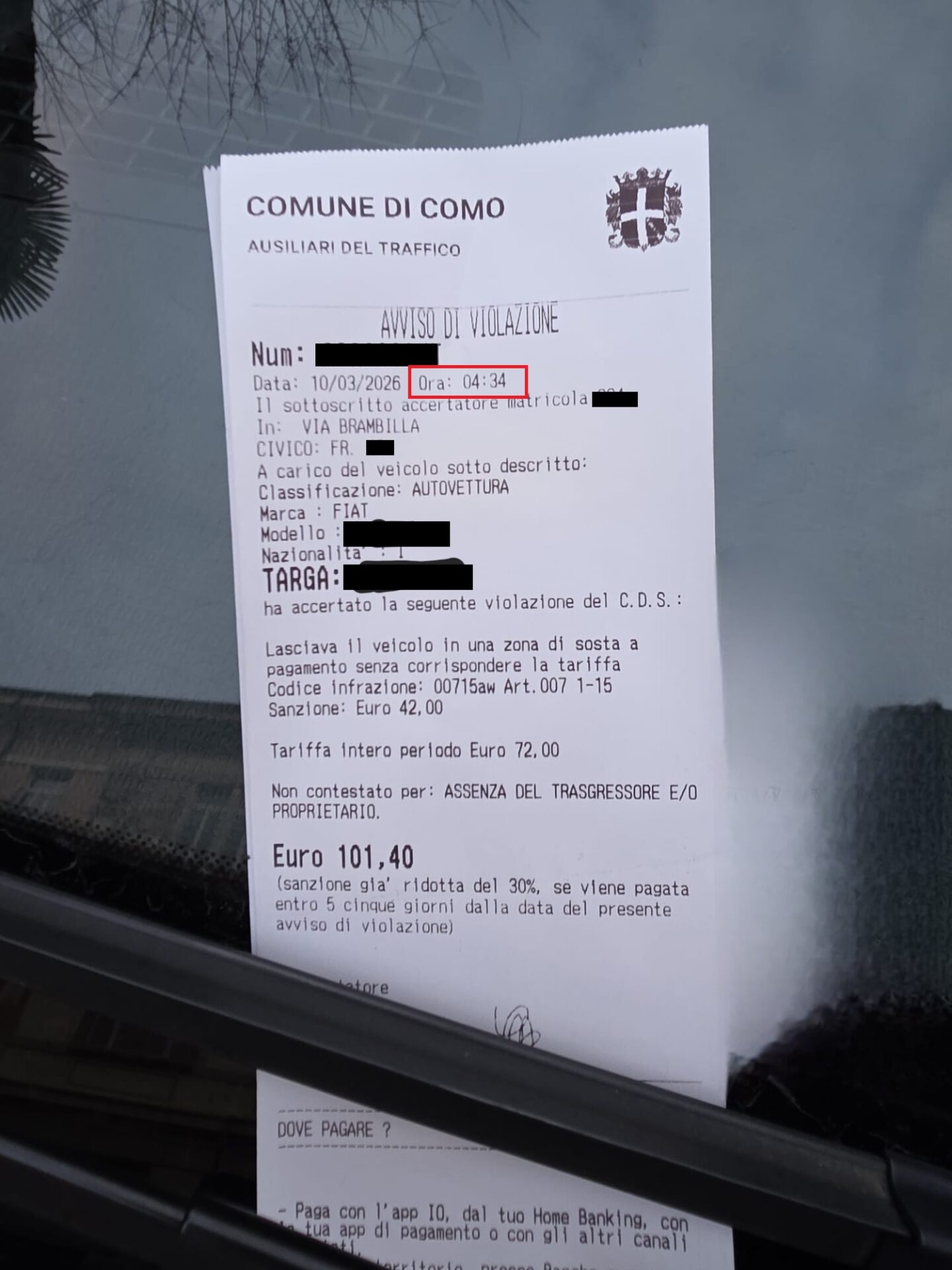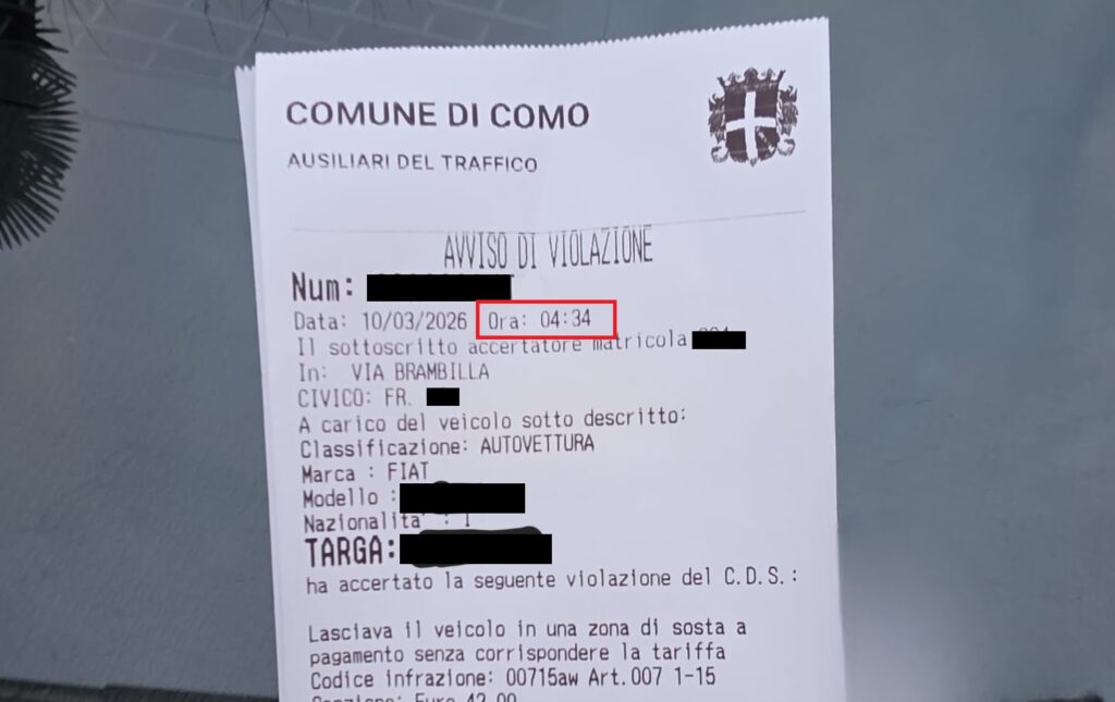 Buongiorno, oggi andando a prendere il bus per il lavoro alle 6.50 ho notato questa multa in via Brambilla a Como. Più che altro l’orario in cui è stata emanata: le 4.34 del mattino.