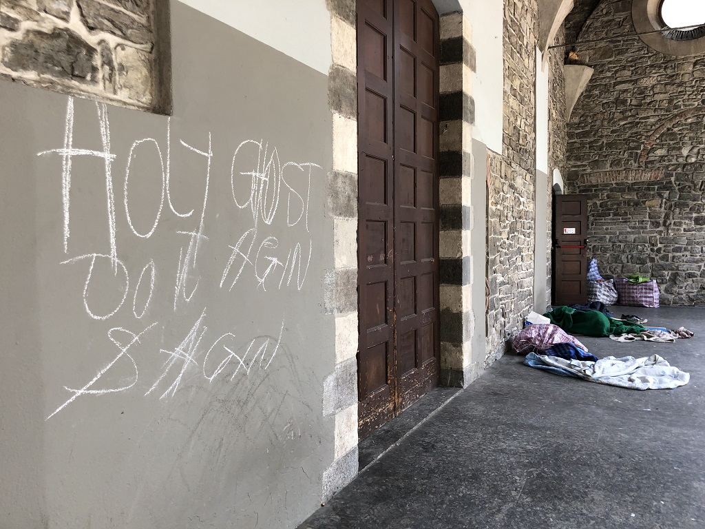 Tra sacchi ammucchiati, coperte di fortuna, cartoni, briciole, sporcizia, formiche, piccioni e ogni altra cosa si possa immaginare, due persone straniere accasciate o quasi. Un giovane di origine africana che dormiva per terra esattamente davanti all’ingresso della mostra in corso nell’ex chiesa (mostra in quel momento regolarmente aperta: da quel corridoio della disperazione devono passare i visitatori); e poi un altro uomo dello Sri Lanka, seduto a consumare il pranzo dall’altro capo del porticato.