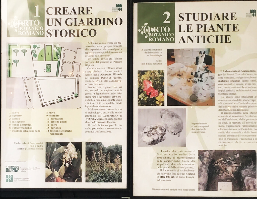 L’orto botanico romano è nato nel 2001 da un’idea di Lanfredo Castelletti, allora Direttore dei Musei Civici e del Laboratorio di Archeobiologia, grazie al contributo degli Amici dei Musei e della Fondazione Provinciale della Comunità Comasca. E’ stato recentemente sistemato grazie all’Accademia Pliniana e, al momento, è visitabile solo in occasione di eventi particolari.