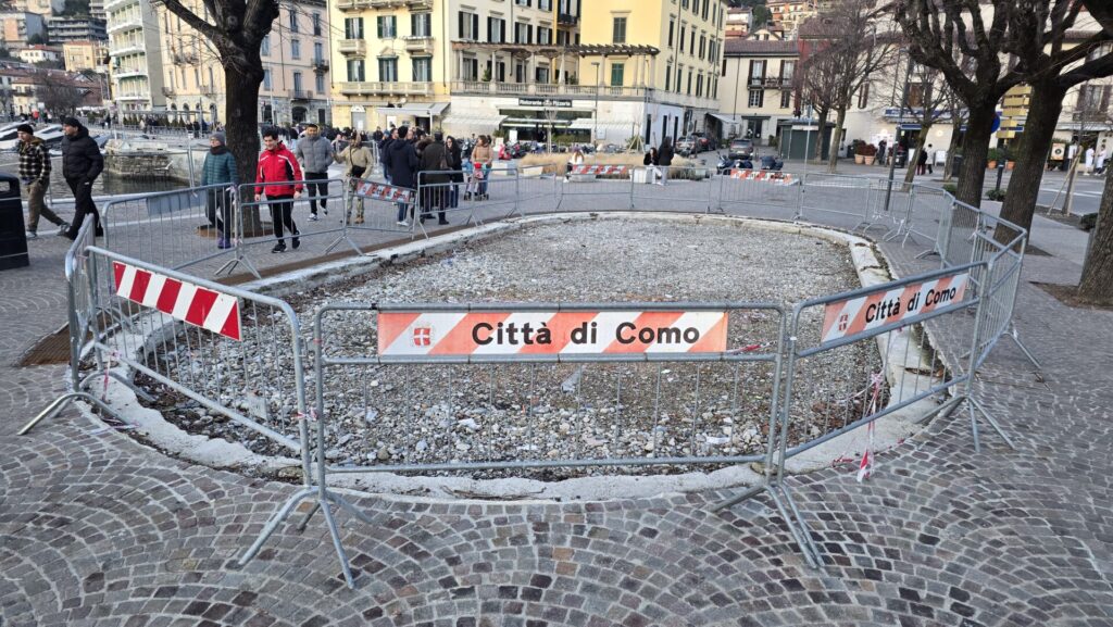 A oggi, 1° febbraio 2026, del vecchio chiosco – smantellato in accordo tra ex gestori e Comune, pur dopo anni di battaglie legali – resta soltanto l’impronta ancora ben visibile sul camminamento, segnata da transenne e assenza di porfido. Niente di troppo difficilmente rimediabile, naturalmente, ma elementi sufficienti per suggerire a un nostro lettore la riflessione personale che potete leggere di seguito (la mail per inviare lettere, repliche, foto e video è sempre redazionecomozero@gmail.com).