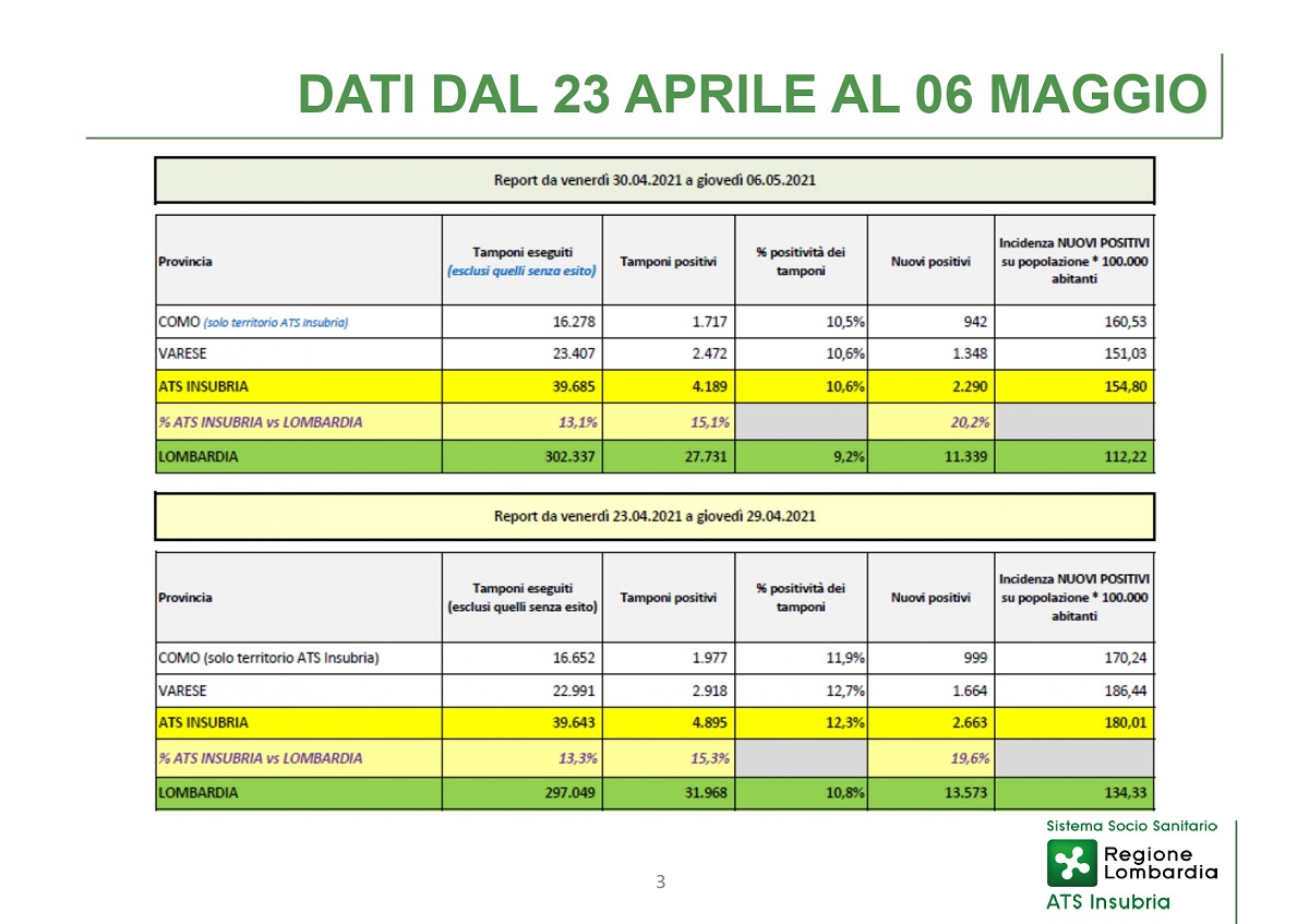 I nuovi positivi a Como e Varese tornano a diminuire. E’ quanto comunicato da Ats Insubria, oggi, nell’aggiornamento settimanale sull’andamento dell’epidemia di Covid.