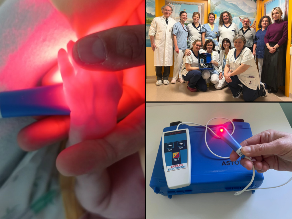 Una metodica di supporto agli operatori è proprio la transilluminazione: una fonte di luce fredda ad alta intensità (gialla o rossa in base alla tipologia del paziente) posta sotto l’arto del neonato che permette di identificare con maggiore sicurezza la vena da pungere e di seguirne il decorso, rendendo quindi la manovra non solo più semplice ma, soprattutto, meno stressante per i neonati. Questa modalità operativa può essere utilizzata anche durante i prelievi ematici, procedura che, vista la complessità dei pazienti, viene eseguita quasi quotidianamente. Si tratta di uno strumento semplice da usare, in quanto richiede un addestramento minimo, le dimensioni sono piccole e quindi è possibile portarlo anche durante gli STEN (servizi di trasporto di emergenza neonatale), agevolando gli operatori nell’assistenza e nella stabilizzazione dei pazienti outborn, prima di trasferirli in Terapia Intensiva Neonatale.