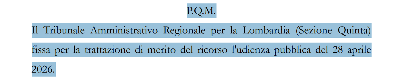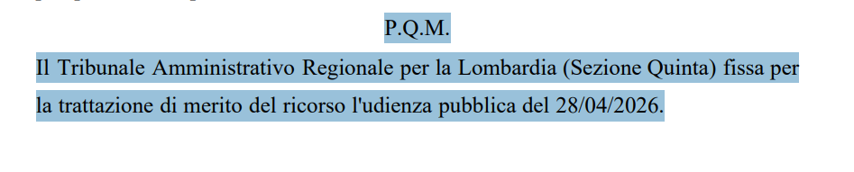 Così è stato stabilito nero su bianco con un’ordinanza pubblicata questa mattina alle 9.23 dopo la camera di consiglio svoltasi ieri con l’intervento dei magistrati Stefano Mielli (presidente), Silvana Bini (Consigliere, Estensore), Concetta Plantamura (consigliere). A richiedere l’annullamento della delibera sono stati gli avvocati comaschi Giovanni Murgia e Ruggero Tumbiolo.