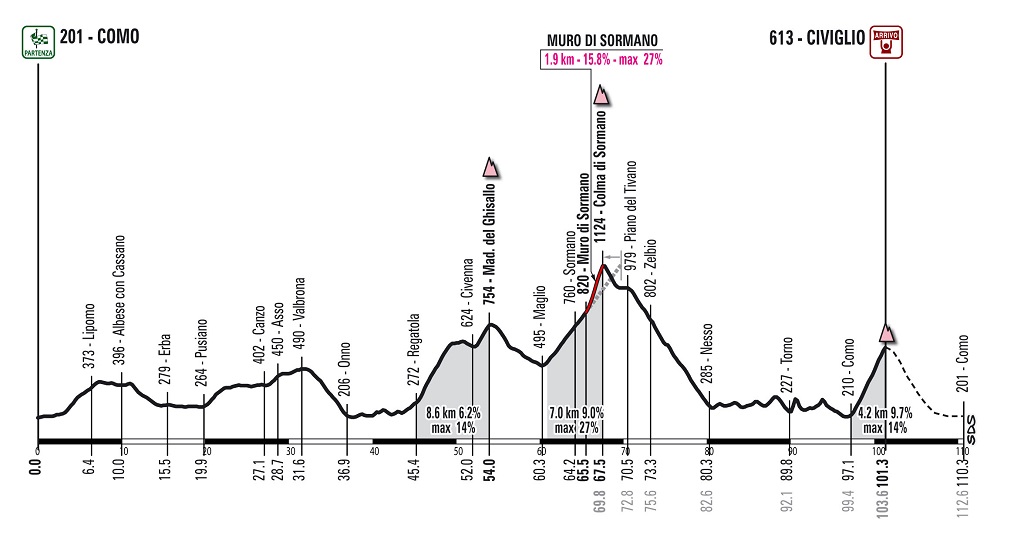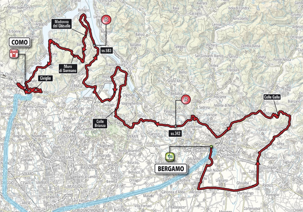 Un percorso molto selettivo che comprende 5 salite e 4.000 metri di dislivello a partire dal Colle Gallo seguito dal Colle Brianza. Dopo Onno, si affronta prima la salita della Madonna del Ghisallo e subito dopo il durissimo Muro di Sormano. Si scende poi per Nesso fino all’ingresso di Como, dove verrà affrontato il Civiglio quindi, dove la corsa nella passata edizione girava a sinistra per scalare la Val Fresca verso San Fermo della Battaglia, proseguirà invece diritto fino alla rotatoria di via Camozzi per incontrare la discesa del percorso originario. Infine, dopo un breve strappo di circa 1700 metri al 5% di pendenza media con punte al 9%, si termina all’ingresso dell’abitato di Monte Olimpino. Da qui all’arrivo, posto come lo scorso anno sul Lungo Lario Trento e Trieste, mancheranno 3 chilometri.